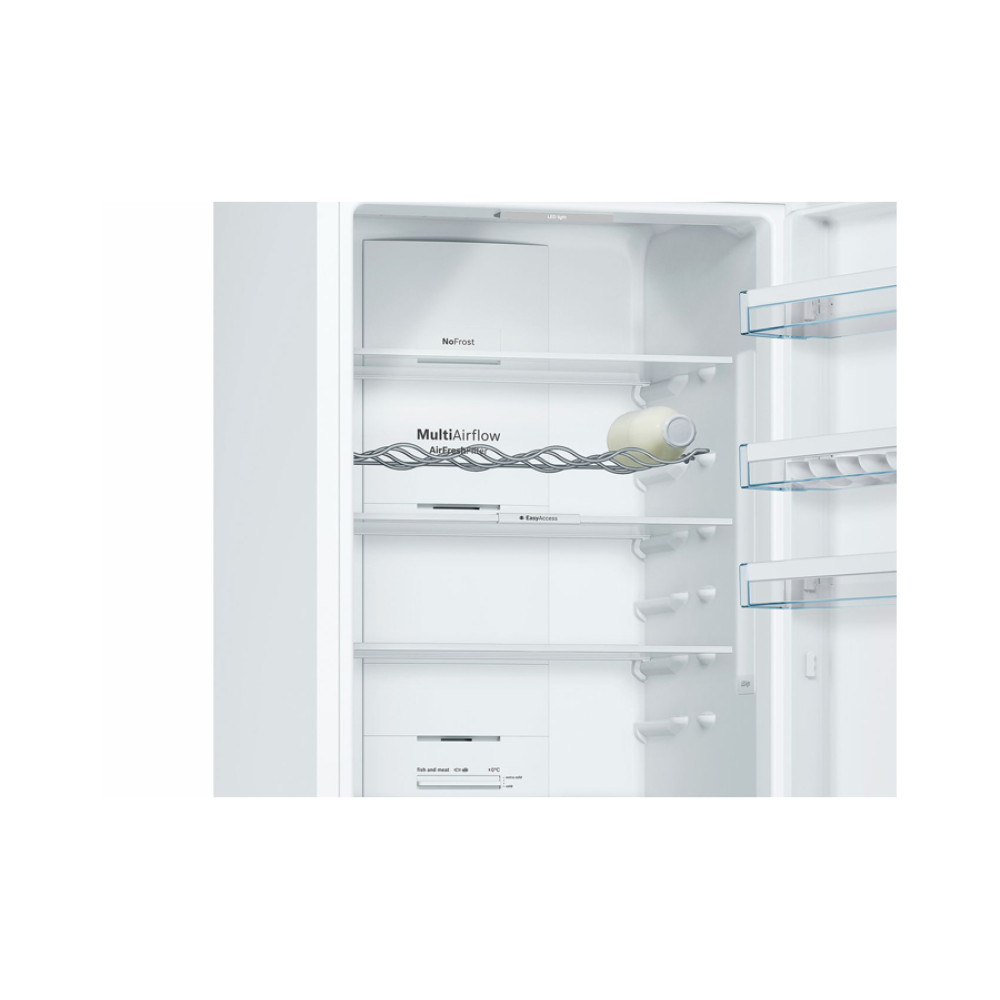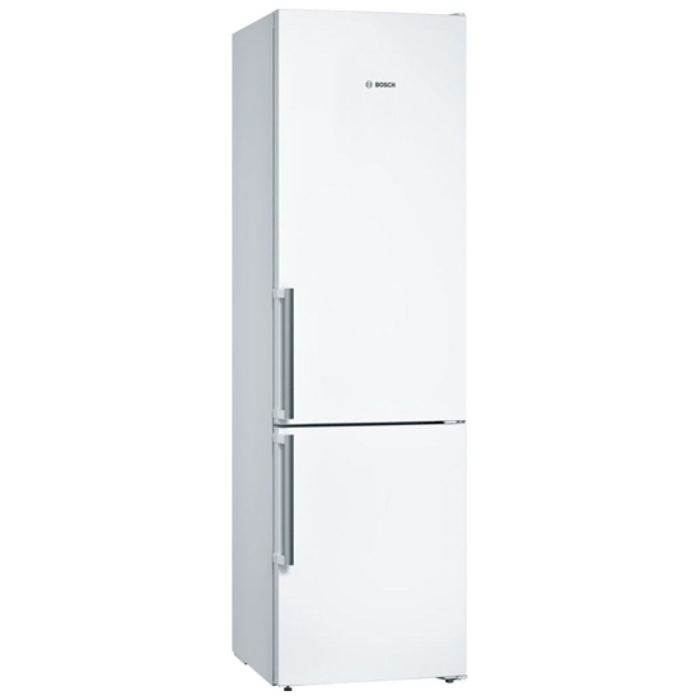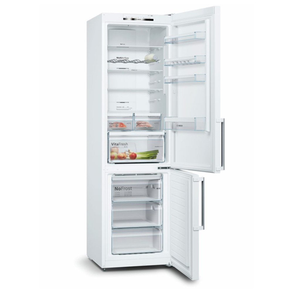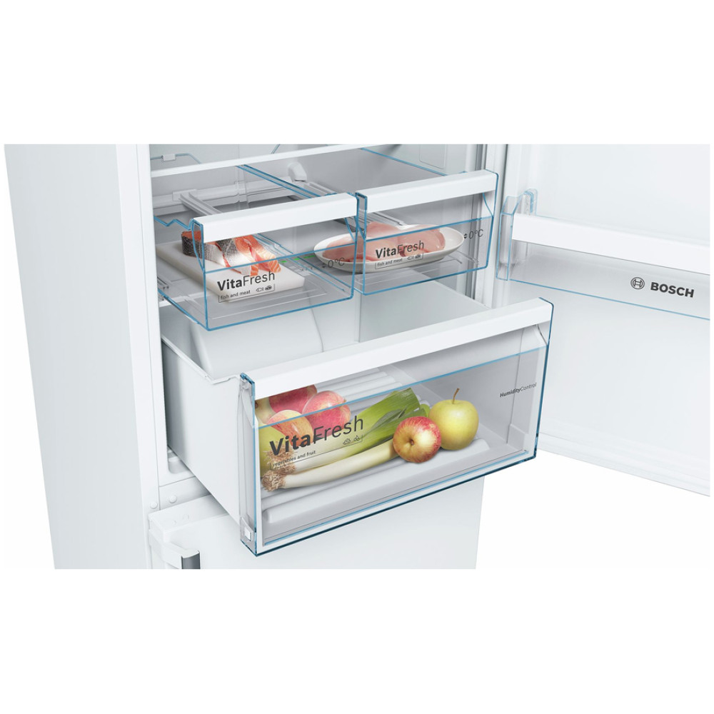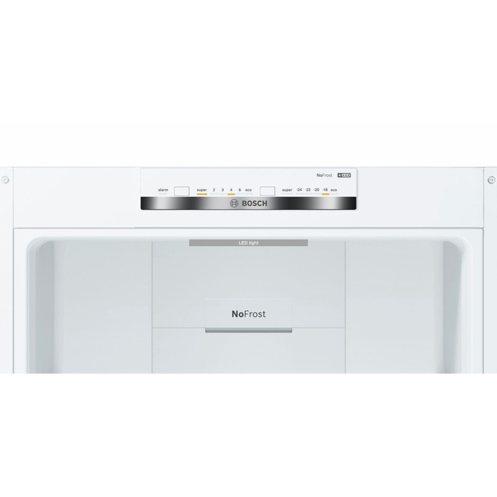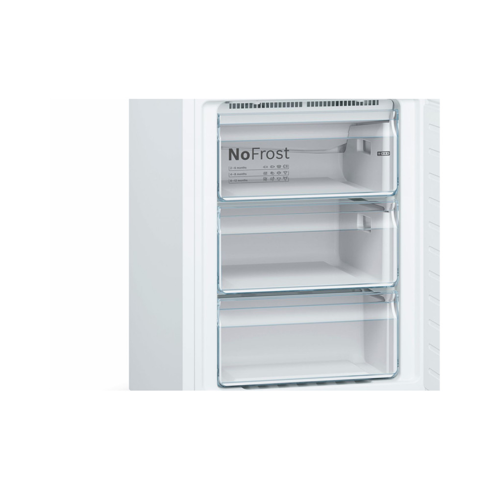Холодильник Бош Serie 4 з нижньою морозильною камерою у білому кольорі. Технологія розморожування NoFrost та від діленням ChillerBox. Роздільне електронне регулювання температури у холодильній та морозильній камерах. Функція швидкого охолодження Super Сooling. Функція швидкого заморожування SuperFreezing з автоматичним від ключенням.
