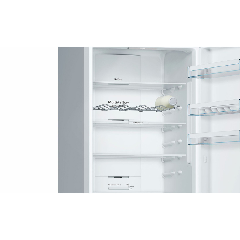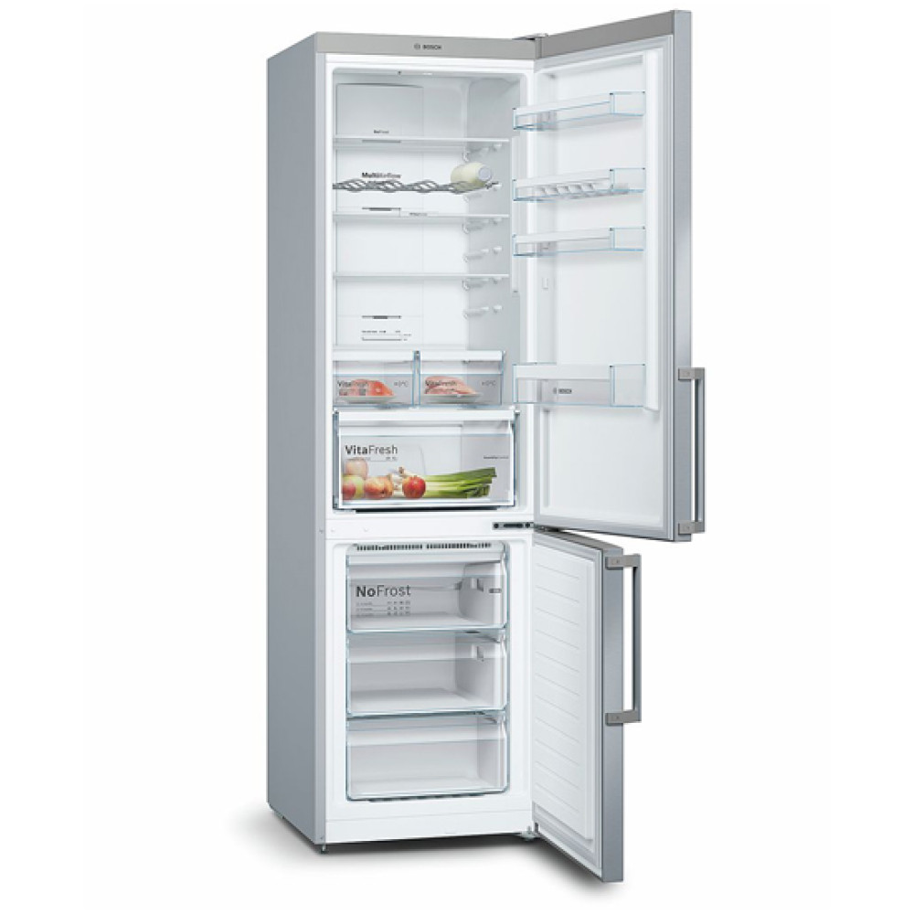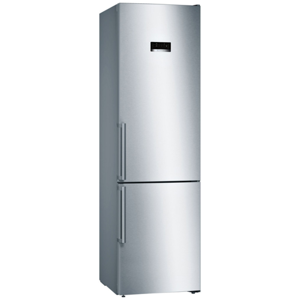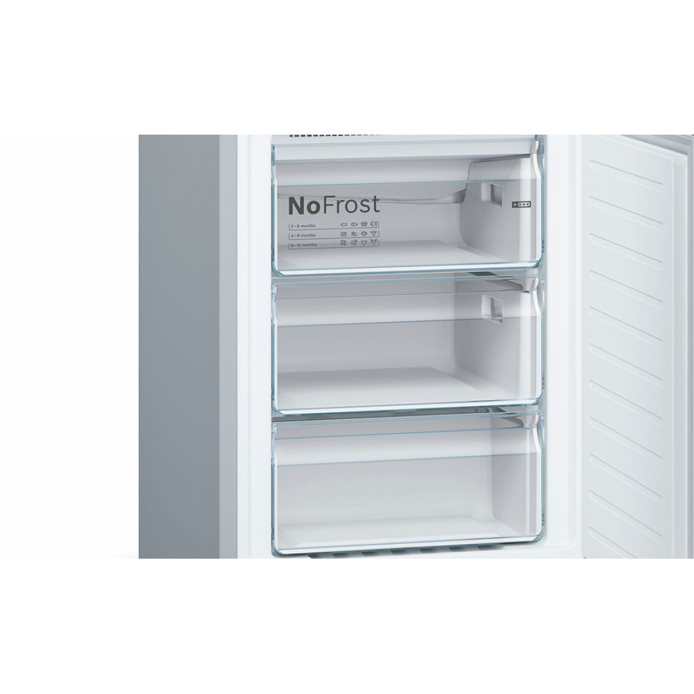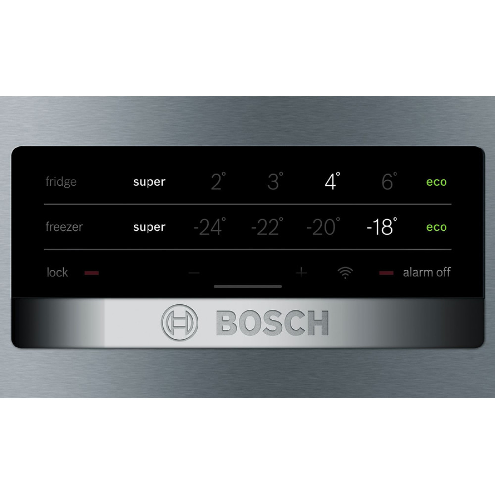 Холодильник Бош Serie 4 з нижньою морозильною камерою. Колір дверцят: Hержавіюча сталь легкого очищення з покриттям Antifingerprint. Технологія розморожування NoFrost. Роздільне електронне регулювання температури у холодильній та морозильній камерах.