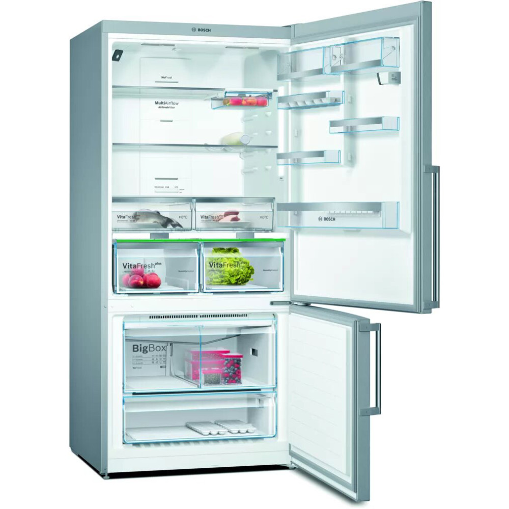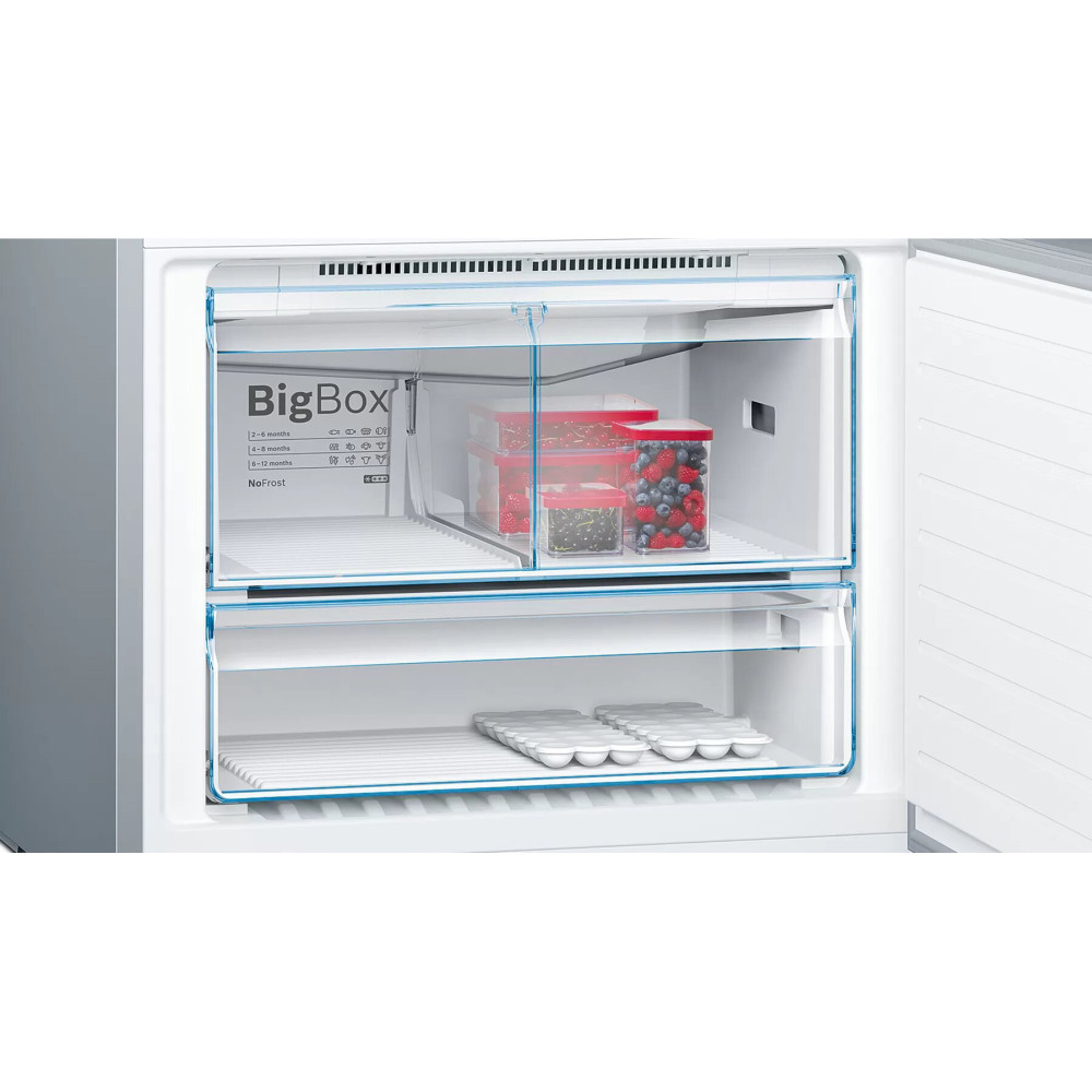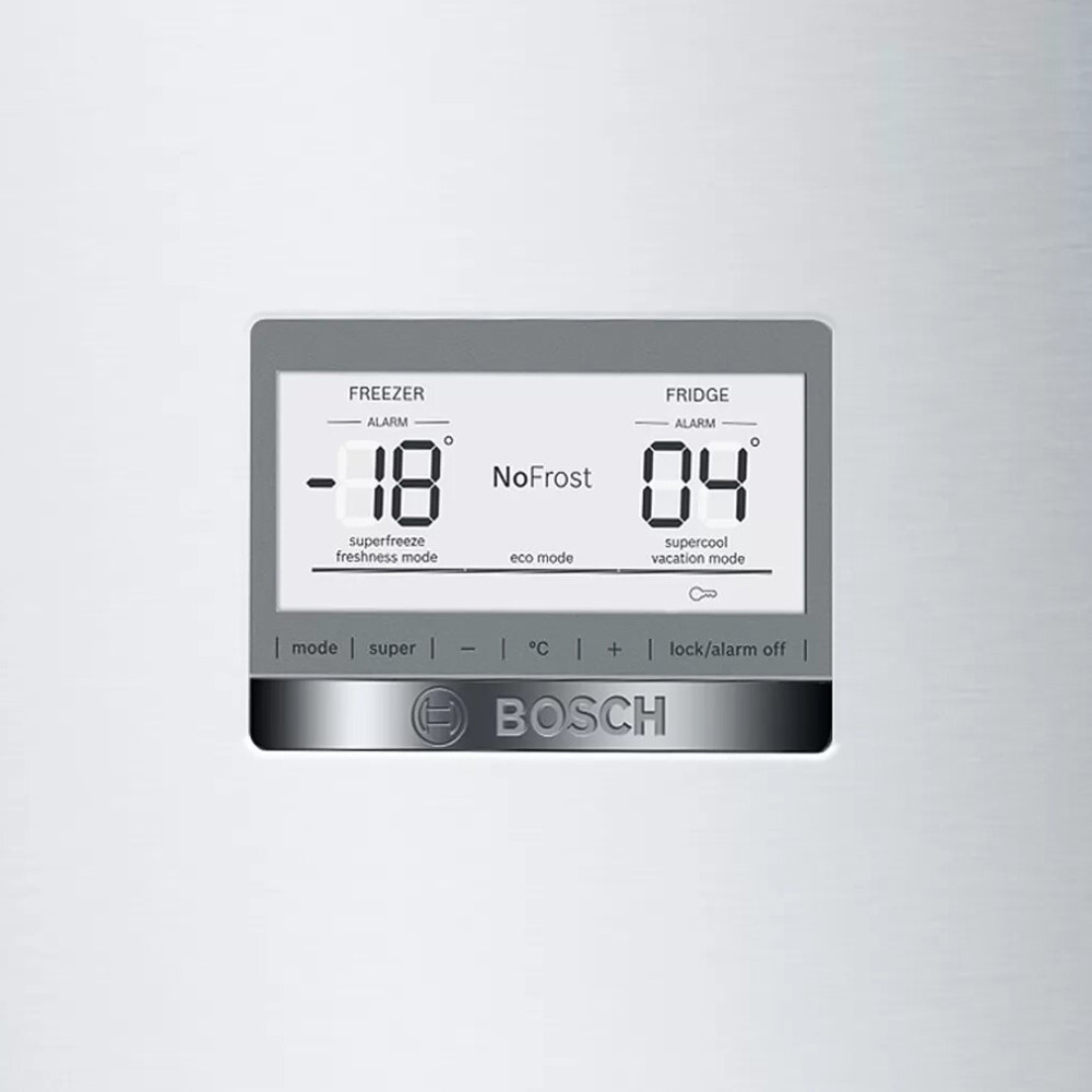 Холодильник Бош 6 Серії з нижньою морозильною камерою на 682 л. VitaFresh plus: зберігає продукти свіжими в два рази довше завдяки оптимальній вологості для фруктів / овочів і низькій температурі для м'яса / риби. Клас енергоефективності: A ++ Світлодіодне освітлення, яке працює без збоїв протягом усього терміну служби пристрою, забезпечує рівномірне освітлення всередині холодильника і не сліпить.