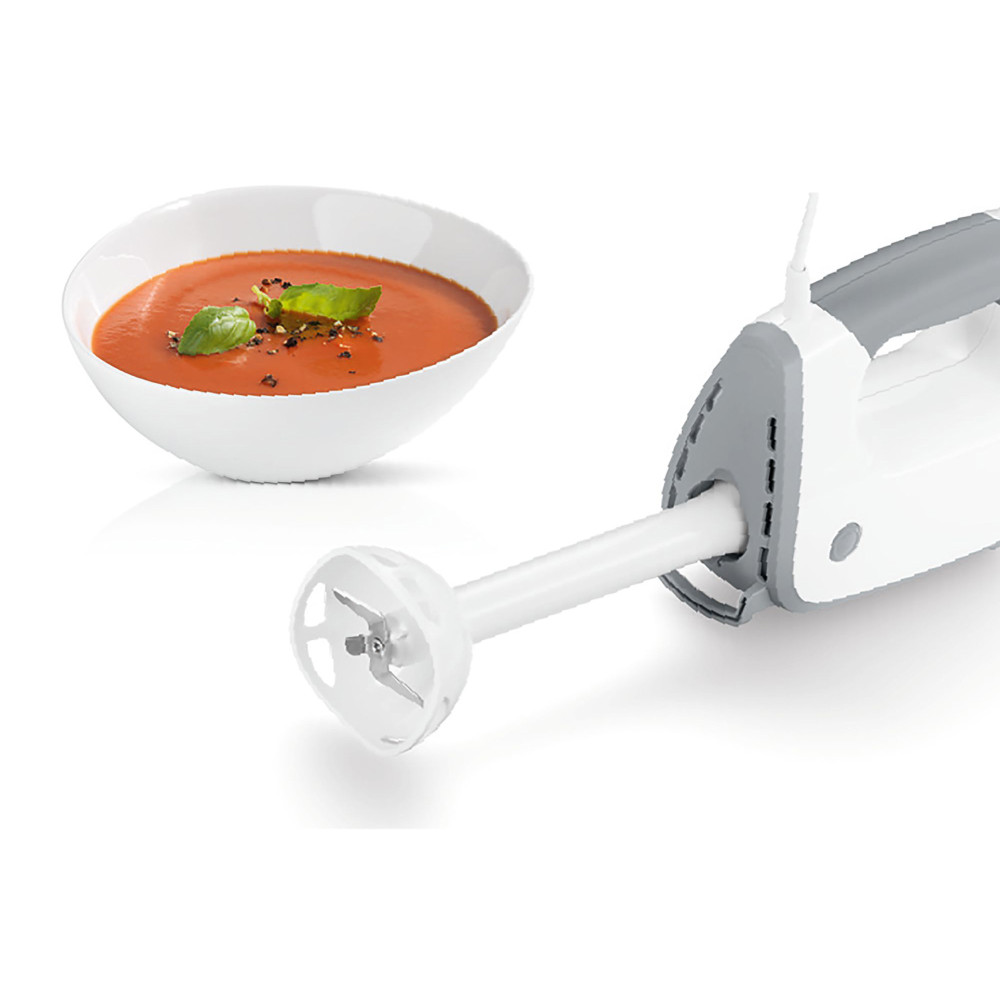 Міксер Бош з чашею: 5 рівнів потужності + турбо-режим. Можливість використання аксесуарів до блендеру. Потужність: 450 Вт. Окрема кнопка для від 'єднання віночків і гаків. Легкий в експлуатації