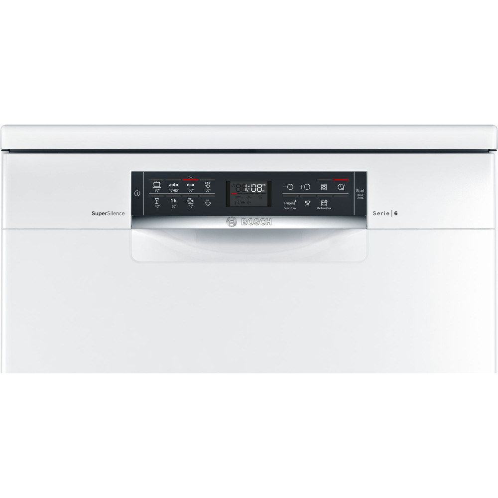 Окремовстановлювана посудомийна машина PerfectDry Serie 6 білого кольору завширшки 60 см. Світлодіодний дисплей для індикації ходу програми та залишкового часу виконання програми. 4 спеціальні функції: IntensiveZone, VarioSpeed Plus, HygienePlus, ExtraDry. Система захисту від протікання води AquaStop. Система рівномірного розчинення миючого засобу DosageAssist.