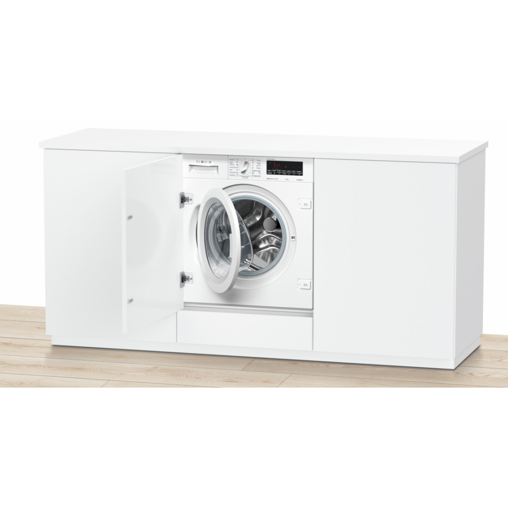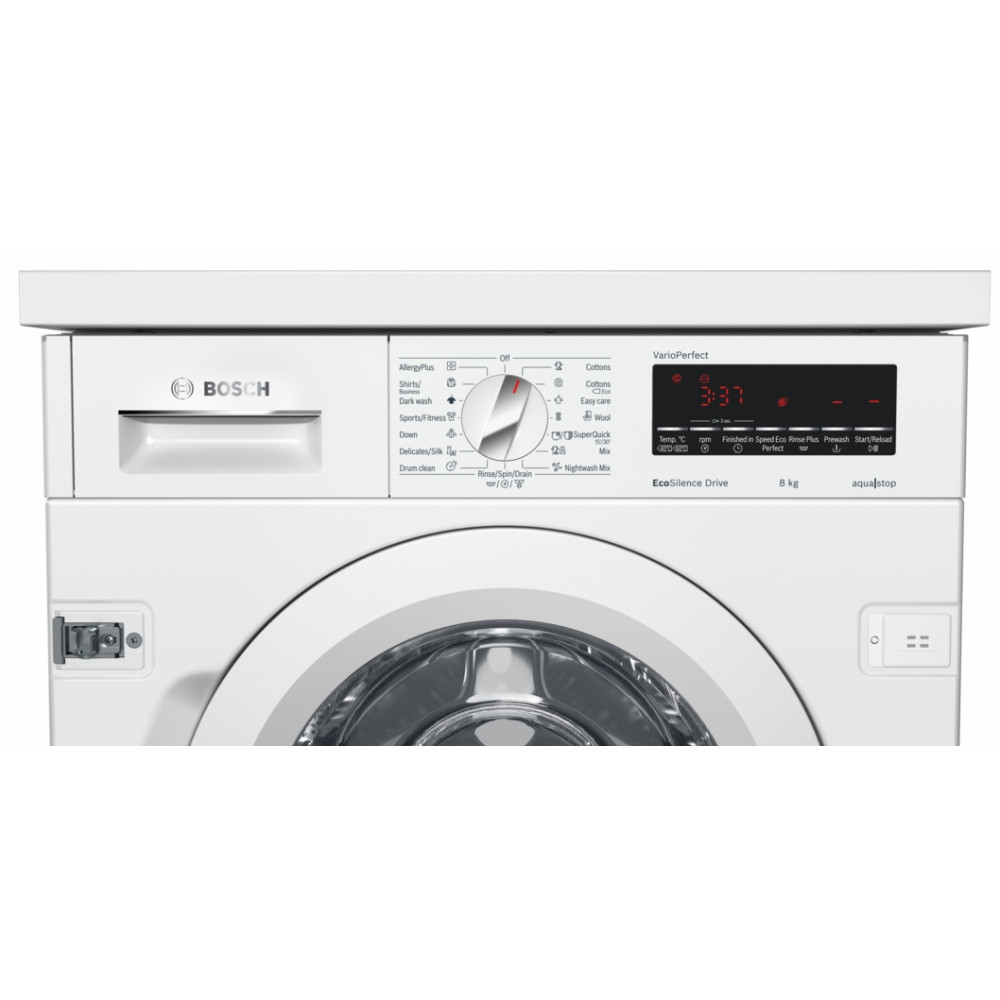 Автоматична пральна машина Бош Serie 8 на 9 кг для вбудування під стільницю. Програмування часу завершення прання (від термінування на 1-24 год). Функція дозавантаження білизни: можливіть дозавантажити білизну навіть після запуску програми. Система захисту від протікання води AquaStop. TimeLight: чітка проекція на підлозі статусу програми та часу завершення прання.